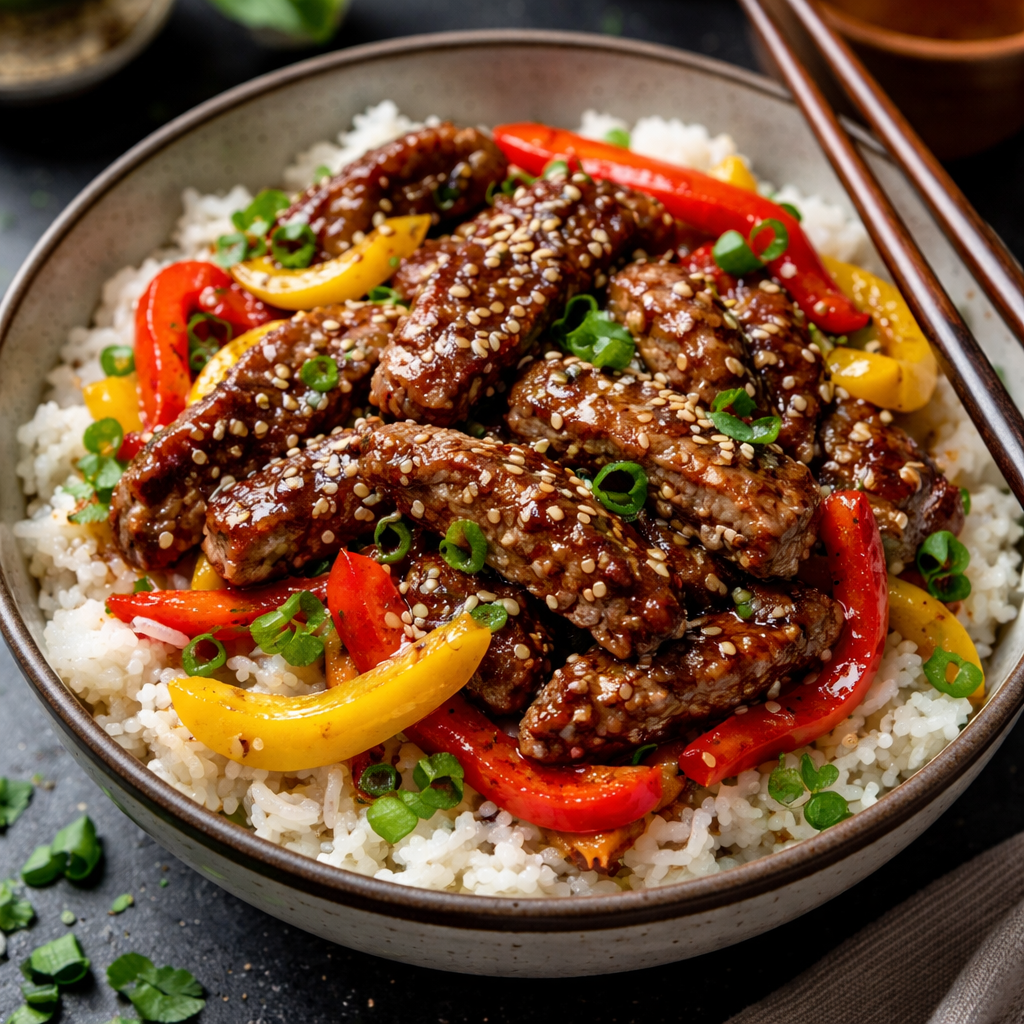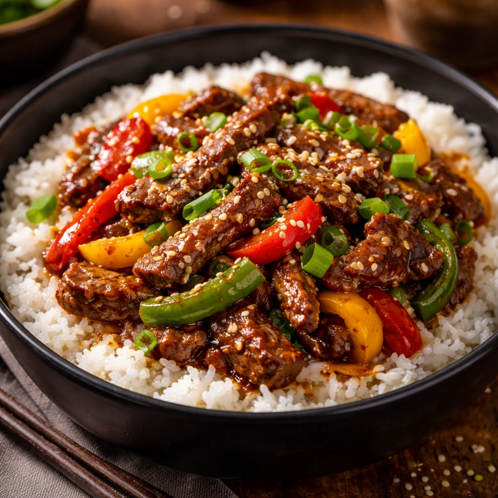 Fluff the rested rice with a fork. Divide into bowls and top generously with the beef and pepper mixture. Garnish with sliced green onions or toasted sesame seeds.