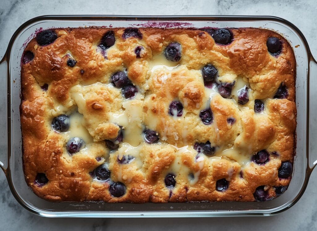 Use a spoon or your hand to gently spread it out. Cover every berry without pressing too hard. This “dump” method is what makes the cake so simple and effective.Blueberry Dump Cake Recipe