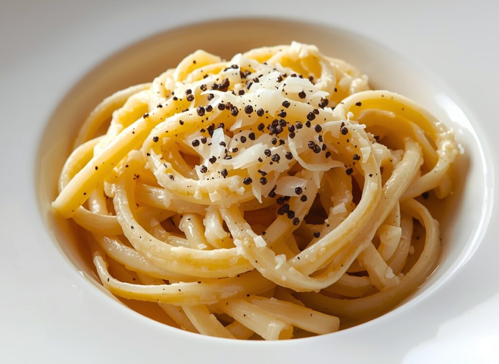 Cacio e pepe means cheese and pepper. Bucatini’s tube amplifies it. Starch from the hollow strands mixes with Pecorino for a glossy coat.Bucatini Pasta Recipes