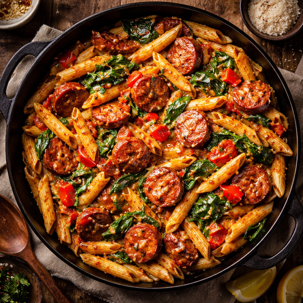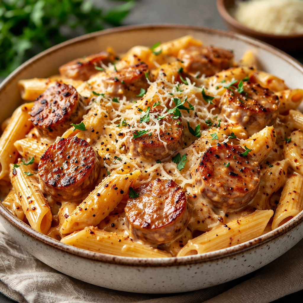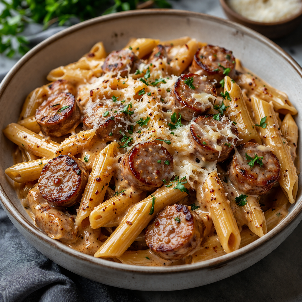 Choose a shape with “nooks and crannies.” Penne, Rigatoni, or Bowtie (Farfalle) are ideal because their textures trap the creamy sauce. Long noodles like fettuccine can work, but they tend to be harder to eat with chunky sausage pieces.