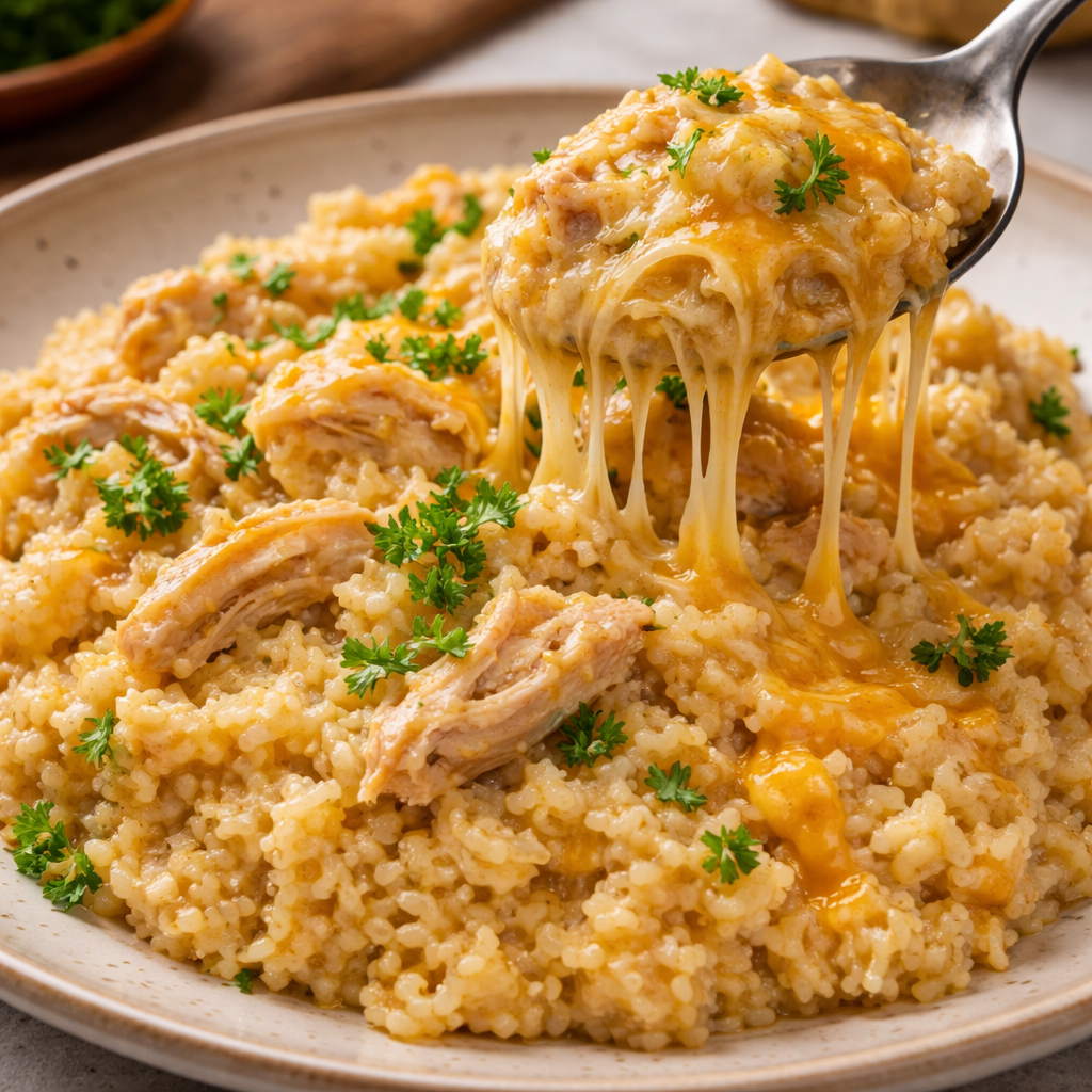 After 5 minutes, the cheese will be melted and the rice will be perfectly tender. Use a fork to gently “fluff” the rice, folding the cheese and chicken together. Serve immediately while it is hot and creamy.