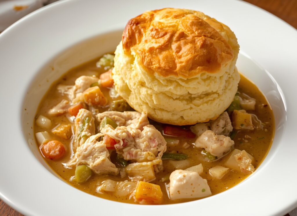 Creamy chicken filling and fluffy biscuits create warmth and satisfaction.