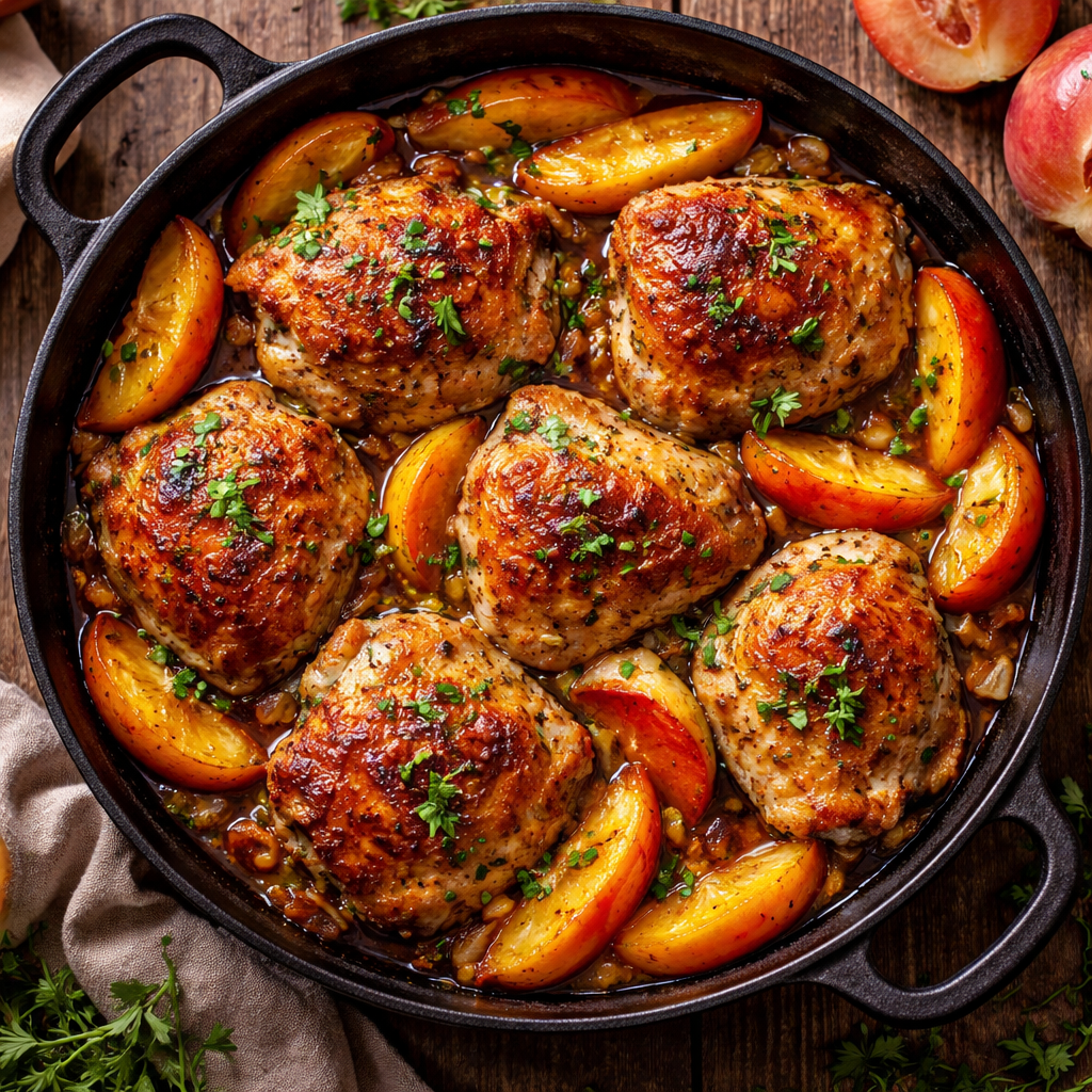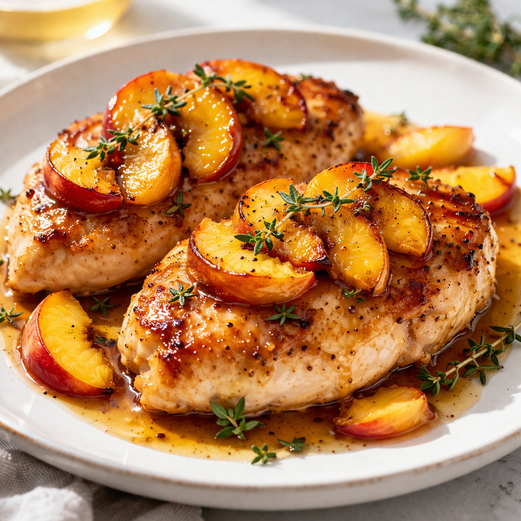 Bone-in, skin-on thighs are the preferred choice for this recipe. The dark meat stays succulent during the roasting process, and the skin provides the rendered fat necessary to “fry” the peaches in the pan. If using breasts, leave the skin on to prevent the meat from drying out.