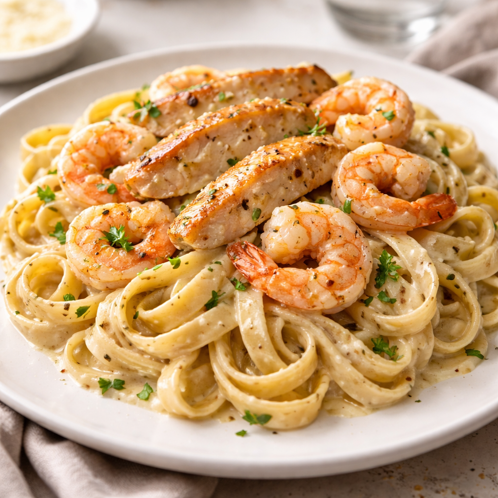 For a hearty meal, serve the chicken and shrimp over linguine, angel hair pasta, or a bed of fluffy jasmine rice. The sauce created in the pan acts as a built-in dressing for the starch.