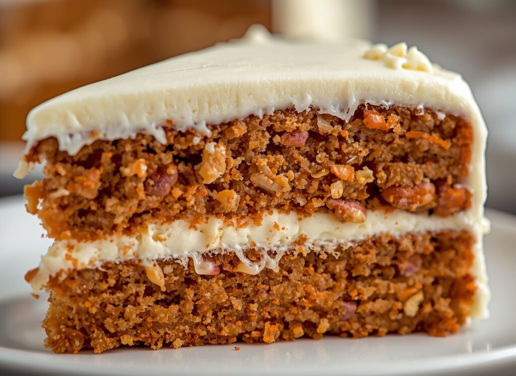 Carrot cake is moist because of grated carrots, oil, and sometimes applesauce or pineapple. These ingredients add natural moisture that keeps the cake soft for days. Unlike butter-based cakes, oil-based carrot cake retains moisture longer, making it perfect for baking ahead of time.