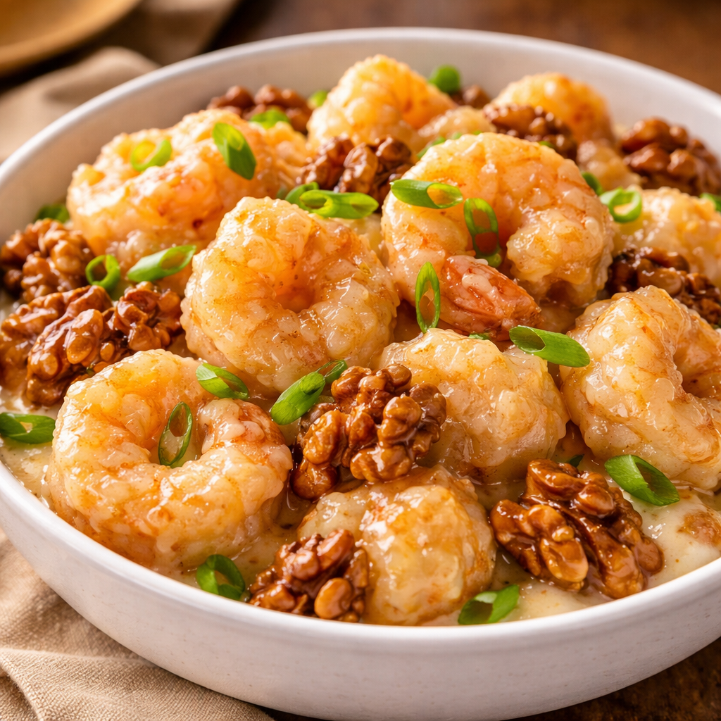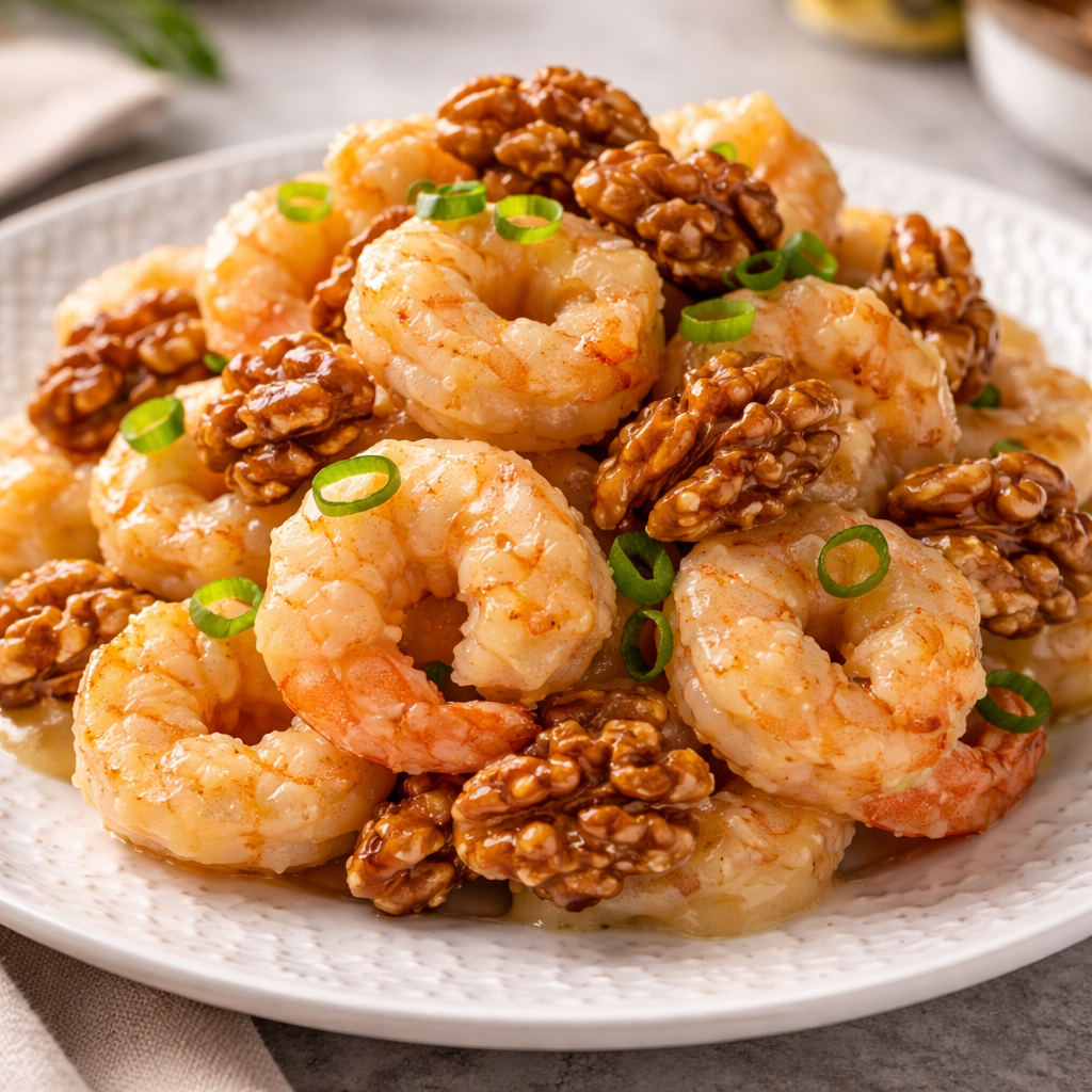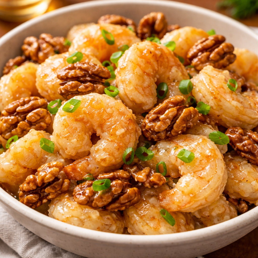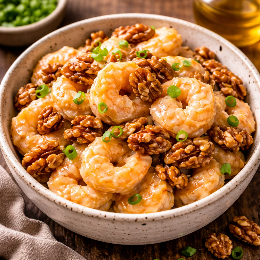 This dish is best eaten fresh. If you must store it, keep the walnuts in a separate dry container. The shrimp will inevitably lose their crunch in the fridge. To reheat, use an air fryer or oven at 350°F to try and revive the coating; avoid the microwave.
