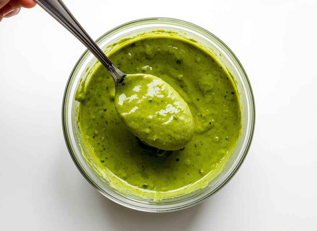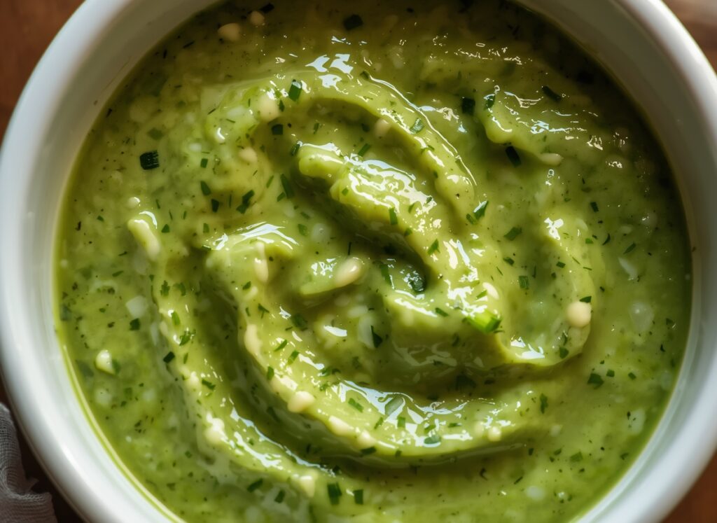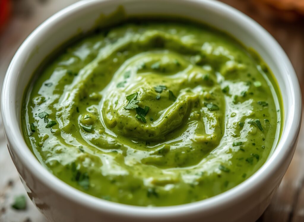 A creamy, herb-based sauce typically made with cilantro, jalapeño, mayonnaise, lime juice, and garlic.