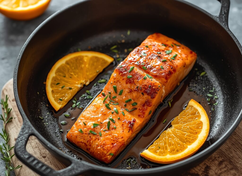 The method we are using involves a “two-stage” approach. First, we sear the salmon to develop a crust and render some of the fat. Second, we introduce the orange-based liquid to “braise-finish” the fish. This technique is much more forgiving than straight grilling or roasting. The liquid creates a steam-cushion that protects the salmon from drying out, while the sugars in the juice caramelize to create a deep, amber color. Once you understand that the sauce is both a flavoring agent and a protective barrier, your confidence in the kitchen will grow.