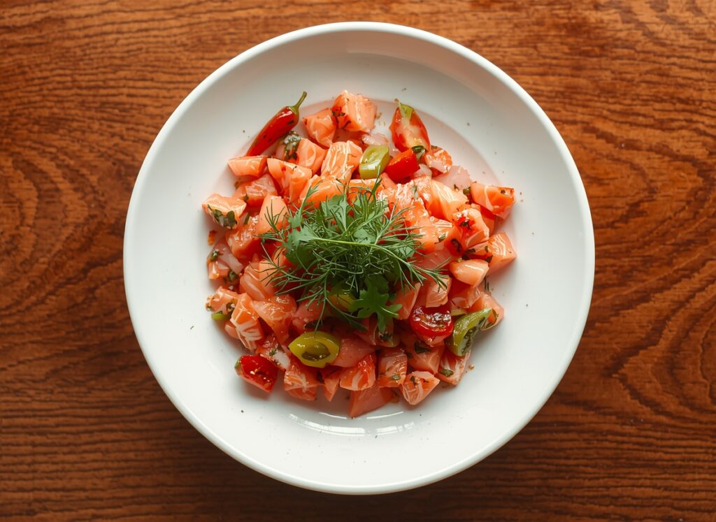 The salmon’s rich fat pairs with tomato’s acid for a lively kick. Onions add sharp crunch that mellows in the chill. Together, they create a balance that’s salty yet clean. Chill all parts before mixing—it locks in crispness and lets flavors bloom without sogginess. Think of it like a cold salad that dances on your plate.