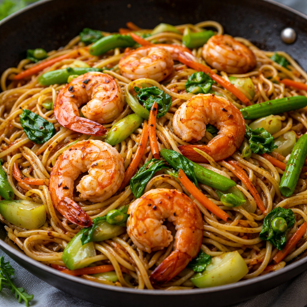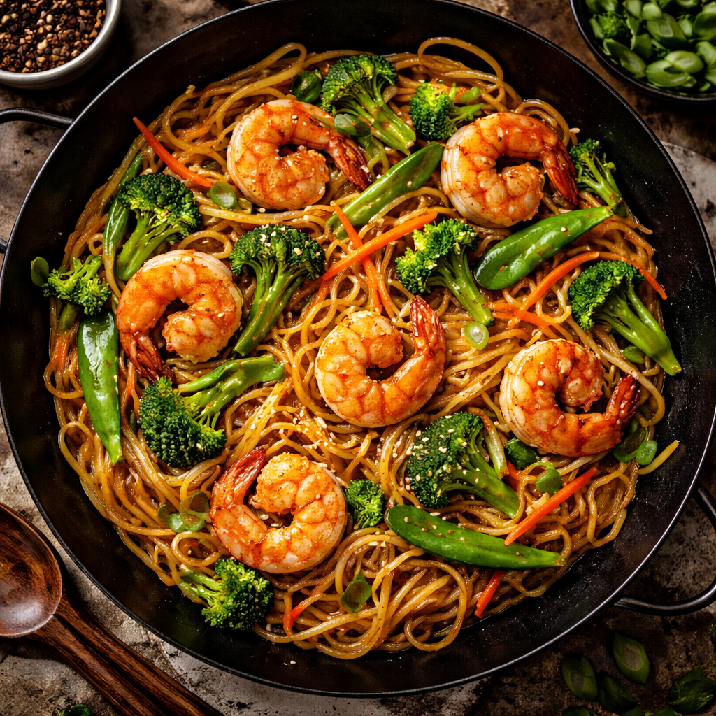 You do not necessarily need a traditional carbon steel wok to make a great Shrimp Lo Mein Recipe, though it is the preferred tool. A large, heavy-bottomed stainless steel or cast-iron skillet can work, provided it has high sides.