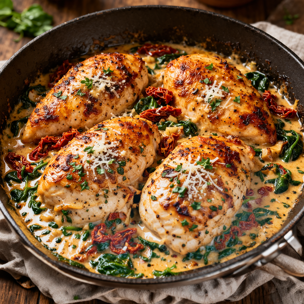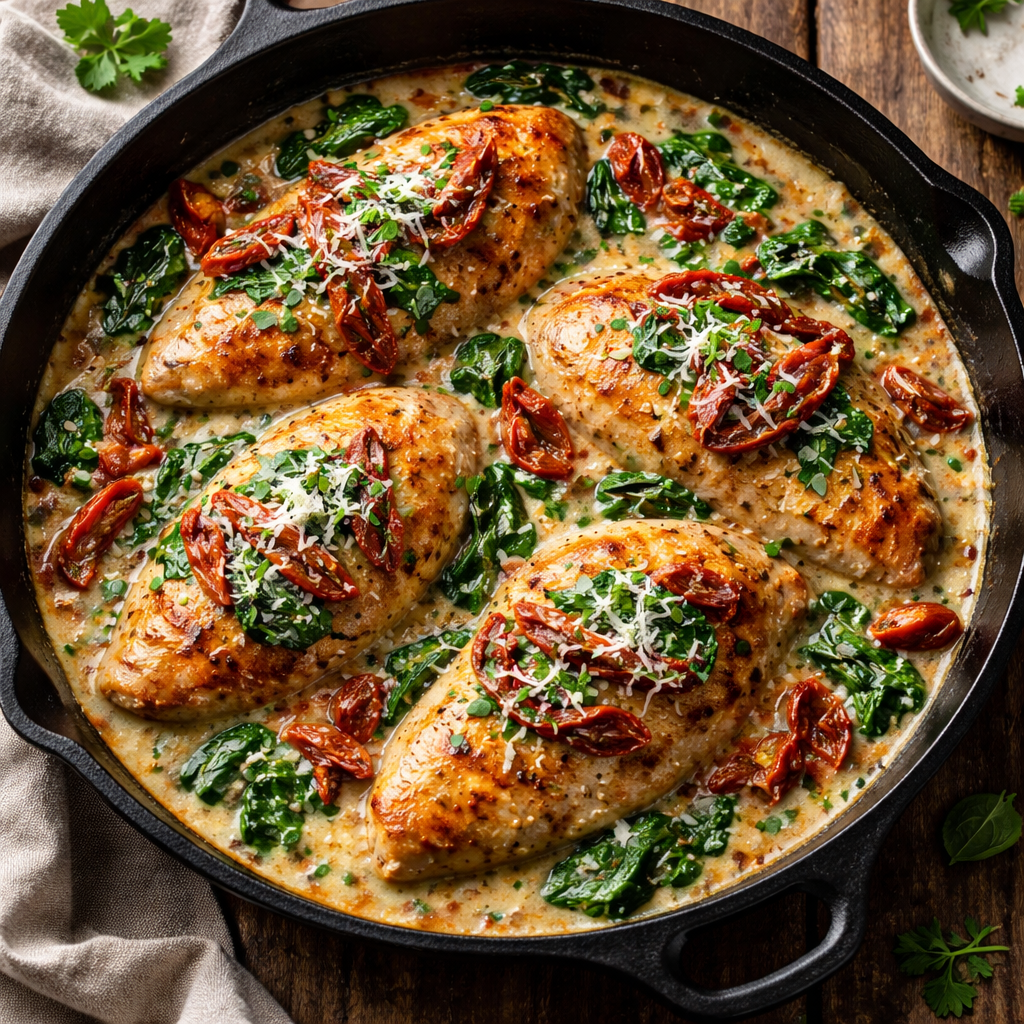 Return the chicken to the skillet. Add fresh spinach and stir until wilted. Simmer for an additional 3–5 minutes until the sauce has thickened and the chicken reaches an internal temperature of 165°F (74°C).